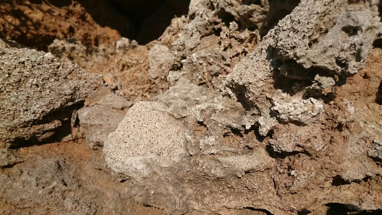 Lovely textures of volcanic rocks where gases bubbled and the shells of  prehistoric sea creatures fused with them.