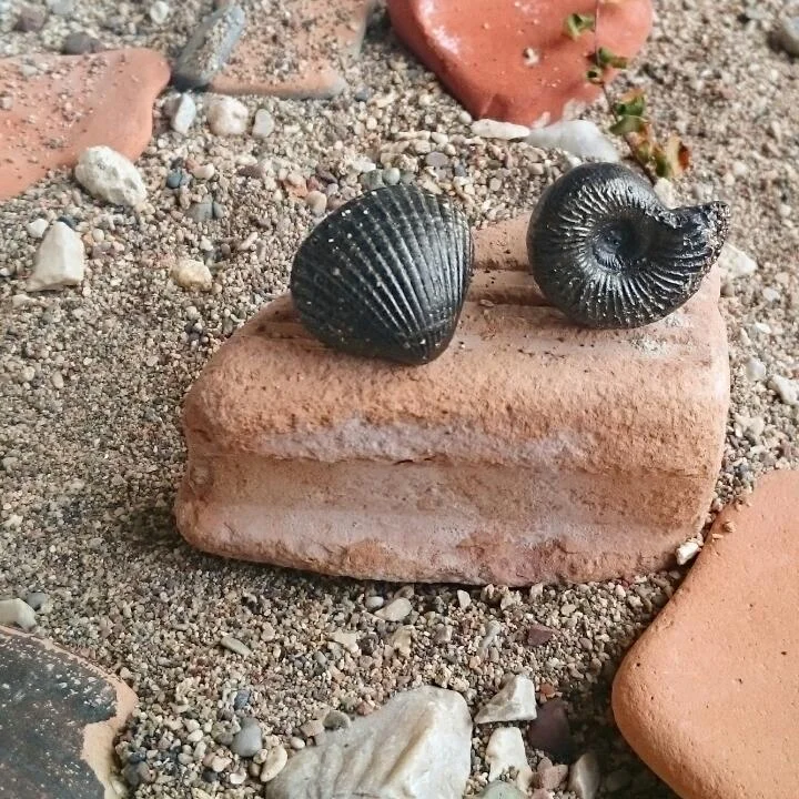 I incorporated sand from the beach we all visited together into a pair of cuff-links. The two shapes are taken from my cast of a real pre-historic ammonite, and a perfect pink shell I found on the beach on our holiday.