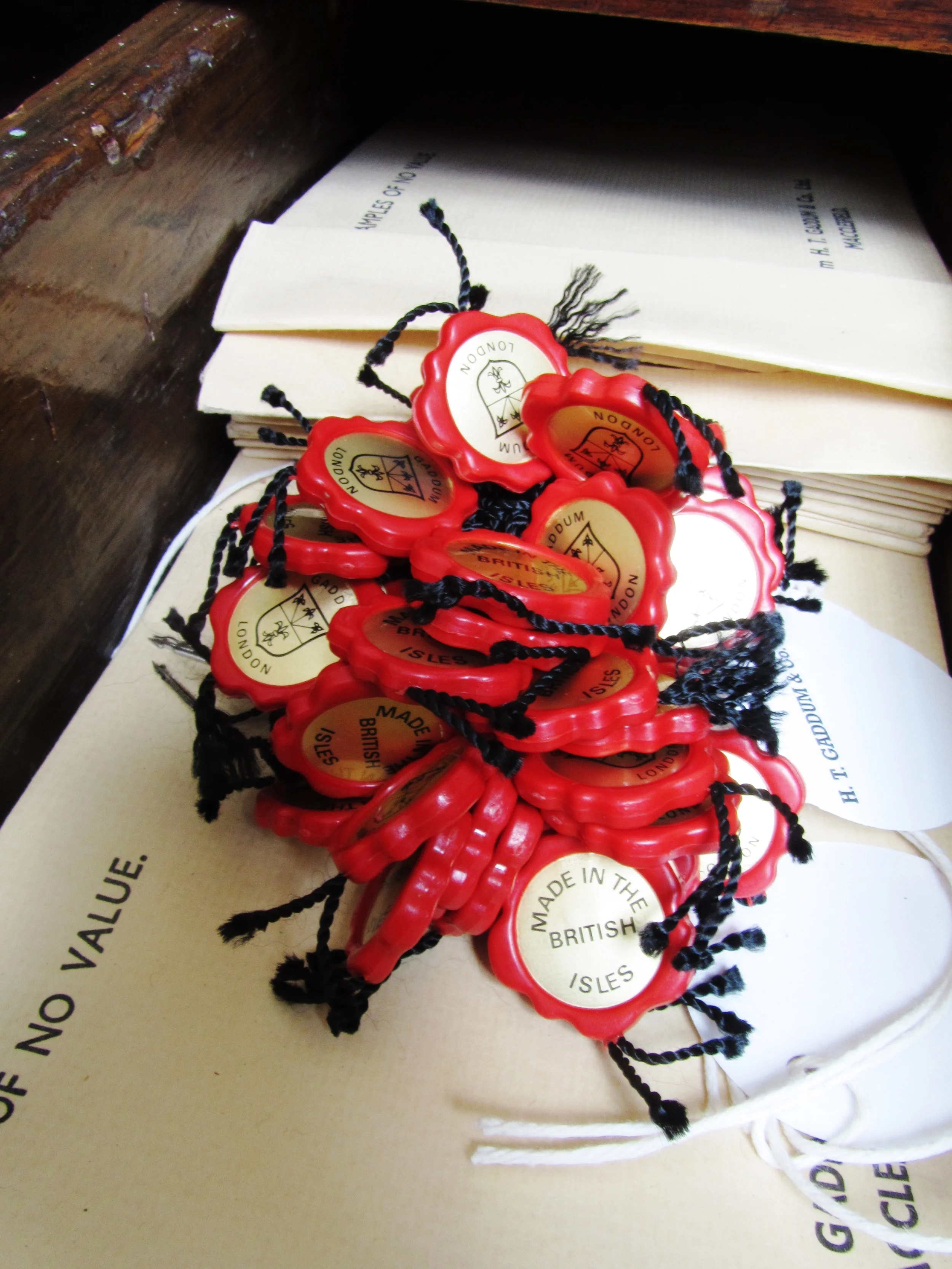 Macclesfield's SIlk Museum has plenty of ephemera from the old silk production on show. These original tags were a sign of quality for their products-made in the style of sealing wax-just like my resin and silver trompe l'oeil button!