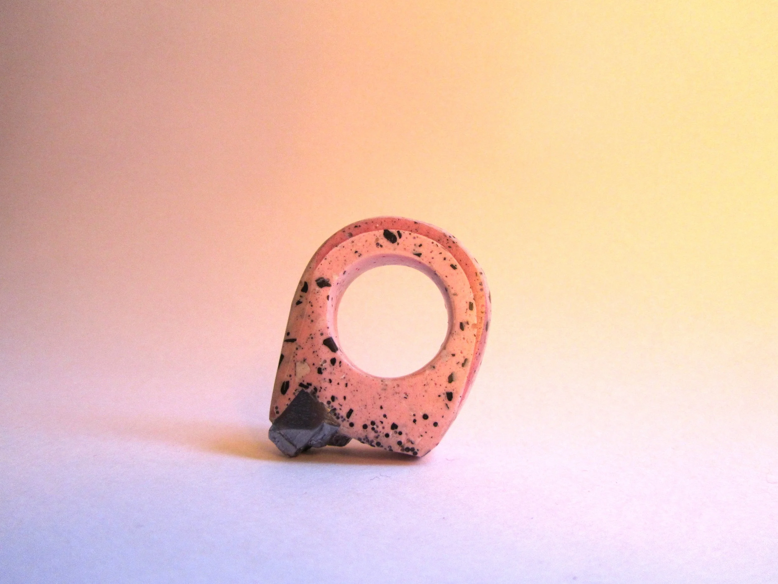The pyrite for their commission was more of a gunmetal colour than most gleaming "Fool's gold", and after discussing different colour options, we decided together that it would be a great contrast to use a pale pink for the ring.